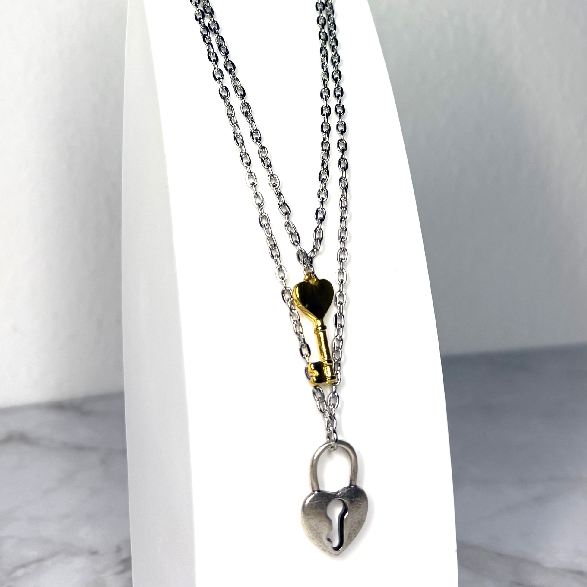 Elegante Halskette im Vorhängeschloss- und Schlüsseldesign mit markanter V-förmiger Silhouette.
