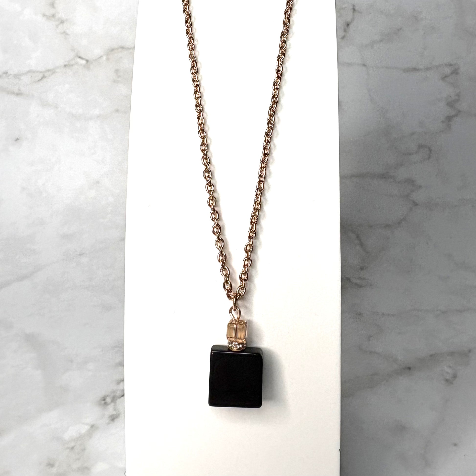 Elegant gearbeitete Halskette mit Anhänger in Form eines Miniatur-Parfümflakons aus markantem Onyx.